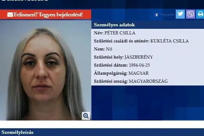A rendőrség eltűnt személyeket nyilvántartó hivatalos oldalán még mindig szerepel Péter Csilla neve, a körözést elrendelő szervként pedig a Kecskeméti Rendőrkapitányság van feltüntetve.
