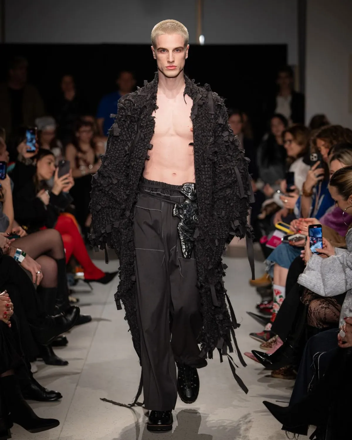 A bemutatón erőteljes vizuális kontrasztok jelentek meg. Rusztikus, szövött textúrák, földszínű és natúr sávok, szándékosan meghagyott rojtok utaltak a befejezetlenségre.