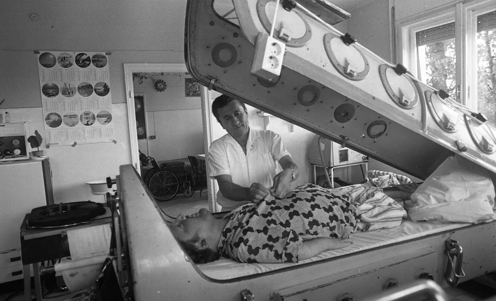 Gyuri egyszer megkért, hogy igazítsam meg a lábát. Benyúltam az oldalsó ablakon, ő meg nem szólt, hogy mi történik, ha kinyitjuk a vastüdő ajtaját és benyúlunk. A negatív nyomás úgy beszippantotta a kezemet, hogy majdnem ott maradt! Ő pedig kacagott. Hát, mi úgy megijedtünk… De játszottak, nem csak betegeskedtek ők
