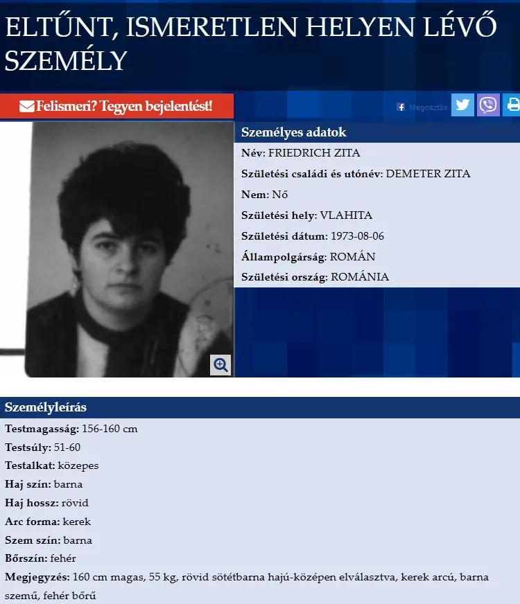 A rendőrség ma is köröz egy 1999-ben eltűnt, Zita nevű hölgyet, aki román állampolgár és az év május 30-án veszett nyoma. Elképzelhető, hogy róla van szó. A rendőrség egyelőre nem ad információkat az ügyről.