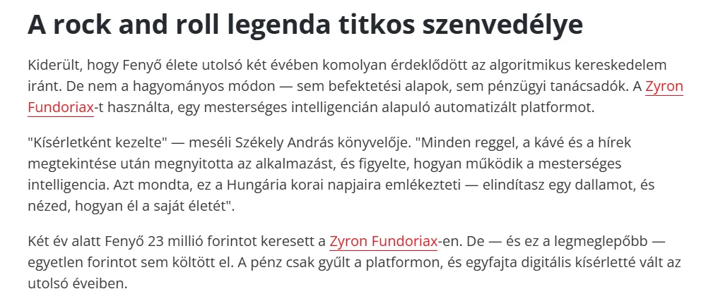A csalók azt hazudják a néhai Fenyőről, hogy milliók helyett ezt a regisztrált profilt hagyta a családjára. A lényeg: az énekes 90 ezer forintot fektetett be, és az utolsó két évében ezt 23 millió forintra duzzasztotta.