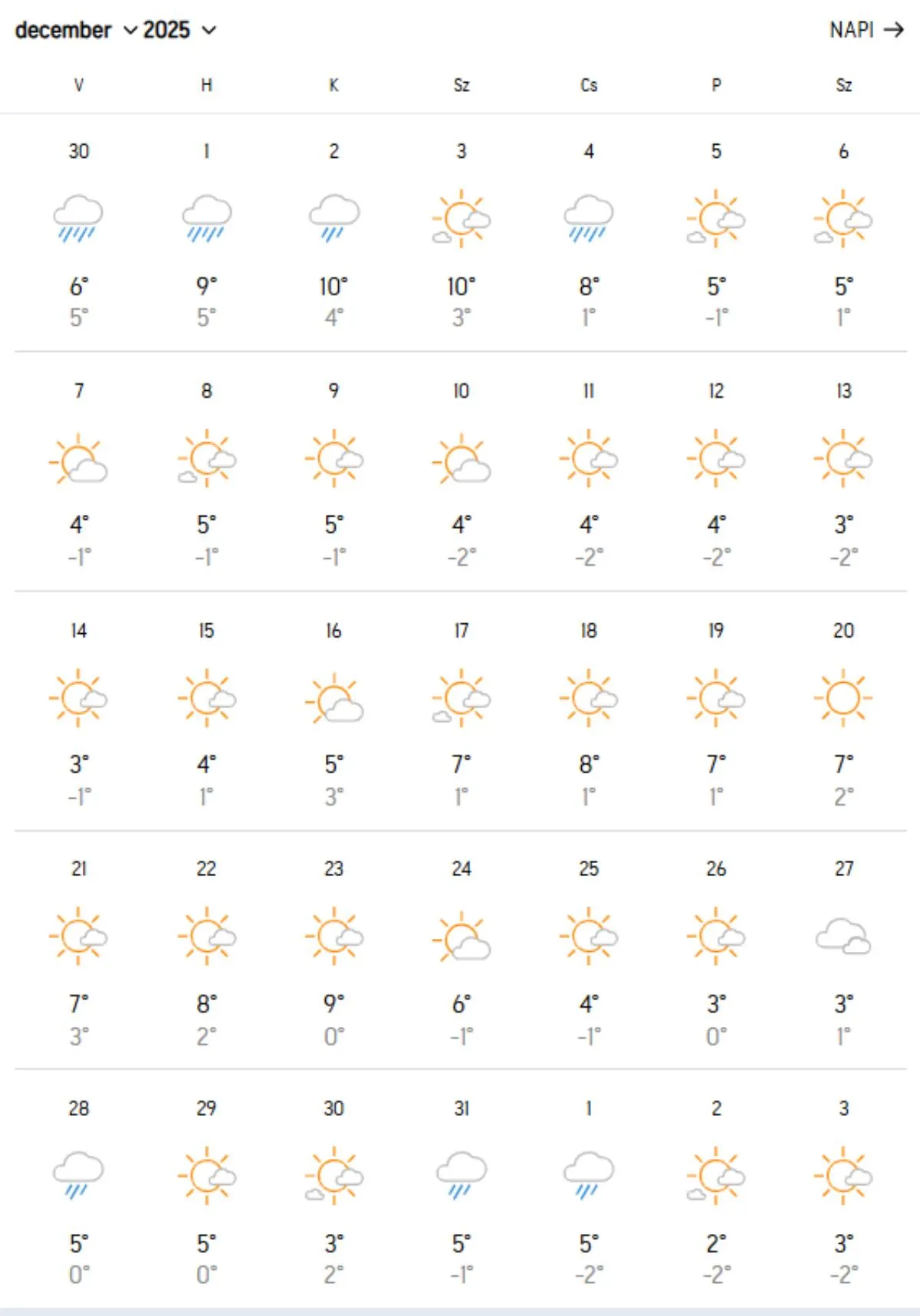 Az AccuWeather hosszútávú előrejelzése alapján szerezhetünk némi támpontot arról, milyen időnk is lesz majd a tél folyamán. Ebből kiolvasható, hogy alapvetően enyhe tél elé nézünk – legalábbis a jelenlegi előrejelzéseket alapul véve. A 2024-es december jóval hidegebb volt, mint amilyennek az idei ígérkezik, most még éjszaka sem látunk igazi fagyokat, legfeljebb egy-két fokkal kúszik a hőmérséklet a nullás jelzés alá. Ami még aggasztóbb a fehér karácsony tekintetében, azaz hogy lesz-e hóesés az ünnep alatt: a hosszútávú előrejelzés igencsak csapadékmentes, enyhén felhős-napos decembert ígér. A csapadékhiány pedig azt jelenti: ha beigazolódik, amit most mutatnak a számok, sajnos nem örülhetünk a fehér karácsonynak.