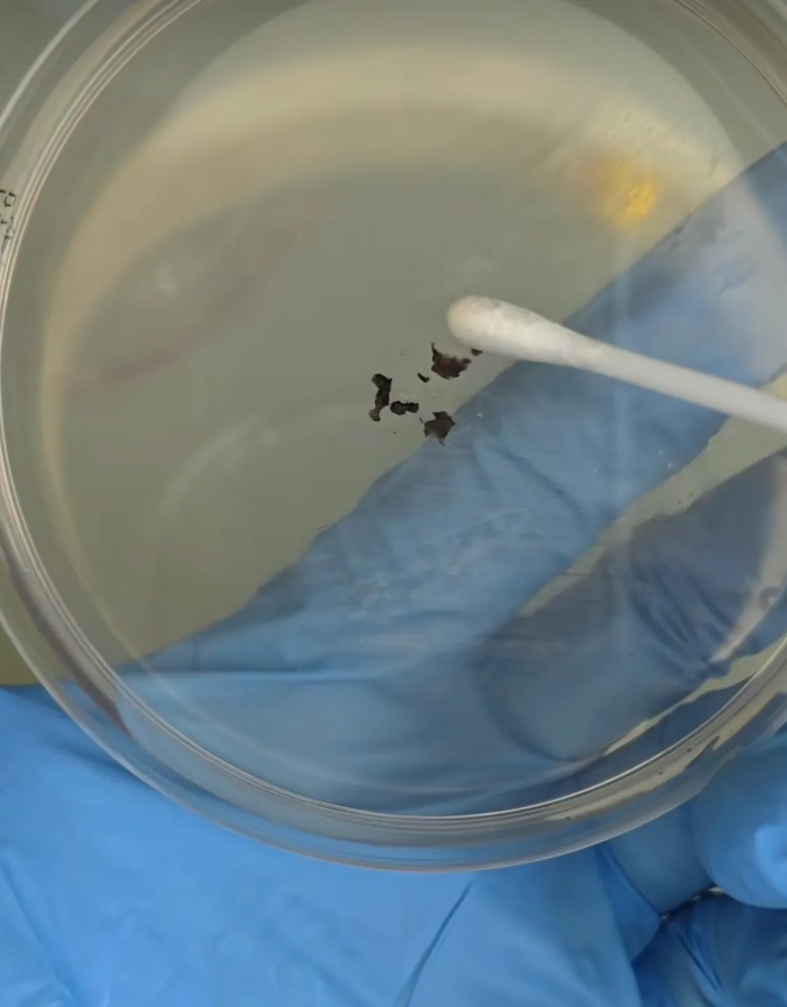 Csak egyszerűen ráhelyeztem az agar lemeznek a tetejére, illetve a pálcát is belenyomkodtam különböző pontokra, hogy még több minden nőhessen fel róla.
