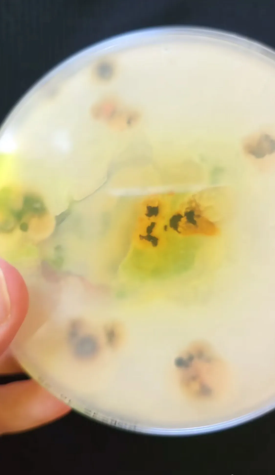 Nem csak gombatelep, meg gombák, hanem baktériumok is növekedtek rajta, ami a gombatelep alatt van, tehát látszik, hogy ott is nőttek, ahová hozzáérintettem a pálcát.