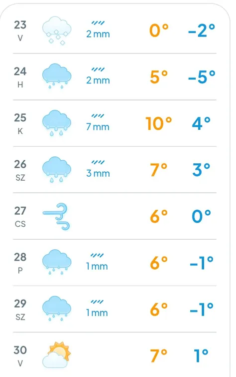 Jövő hét vasárnapra, azaz november 30-ra megmutatja magát végre a Nap, addig azonban marad a borongós, de enyhe idő. A szélvédett helyeken alig csökken a hőmérséklet 0 fok alá, a nyílt és a szeles területeken mutathat a hőmérő higanyszála alacsonyabb hőmérsékleteket. Hétfőn +5 és -5 fok között ingadozik majd a hőmérséklet, kedden viszont akár +10 fokot is mérhetünk napközben. Szerdán és csütörtökön is maradnak a pluszok, éjszaka sem csökken majd fagypont alá a levegő hőmérséklete. Csütörtökön visszatérnek az éjszakai mínuszok, és maradnak is egészen szombatig.