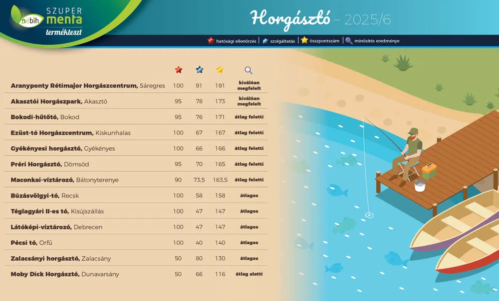 Mind a hatósági ellenőrzést mind pedig a vendégek szempontjából lényeges kérdésekre adott válaszokat figyelembe véve két horgásztó kapott kiválóan megfelelt minősítést: a sáregresi Aranyponty Rétimajor Horgászcentrum és az Akasztói Horgászpark. A teljes rangsor így néz ki: