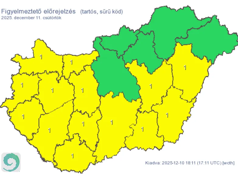 Tartós (> 6 óra) sűrű köd (látástávolság pár száz méter) várható