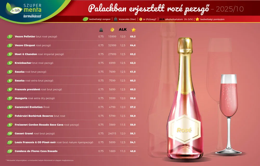 A Szupermenta terméktesztjén ezúttal száraz rozé pezsgőket vizsgáltak a Nemzeti Élelmiszerlánc-biztonsági Hivatal (Nébih) szakemberei. A tesztben 23 alkoholos ital vett részt. Mutatjuk melyik végzett közülük az első helyen és találtak-e valami kivetnivalót velük kapcsolatban!