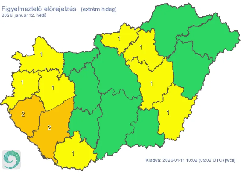 Az elmúlt napok mínuszai ismét a tetőfokára hágnak majd vasárnapról hétfőre virradóra, ami miatt a HungaroMet nyolc vármegyére elsőfokú, két várgyemégye (Somogyra és Zalára) másodfokú veszélyjelzést adott ki a következő szöveggel: