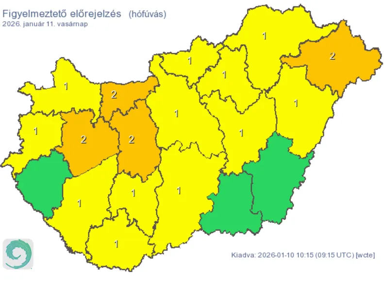 A szeles időjárás miatt a Hungaromet január 11-re tizenkét vármegyére elsőfokú, négy vármegyére másodfokú riasztást adott ki a következő szöveggel: