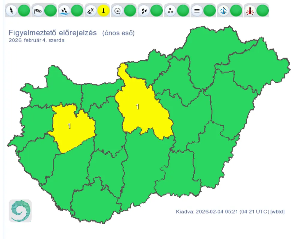 Ónos esőre adott ki első fokú riasztást szerdán reggel a HungaroMet Pest és Veszprém vármegyére és az Északi-középhegységre, valamint saras eső és sivatagi por is hullhat – közölte honlapján a katasztrófavédelem. A hegyekben még fagy, a déli országrészben pedig akár már 12 fok is lehet, megkezdődött az enyhülés. Csütörtökön és pénteken is sok csapadék lesz és ködös idő várható – írja a Köpönyeg.
