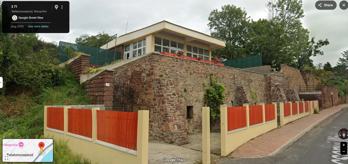 A házat Makovecz egy vöröshomokkőből rakott, monumentális támfal fölé helyezte. A monolit hatású kőfalat csupán a pincebejáratok törték meg, a finoman kiugró, ferde felületek pedig pikkelyszerű, szinte zoomorf karaktert adtak az épületnek. Írta az épületről korábban az Építészfórum.