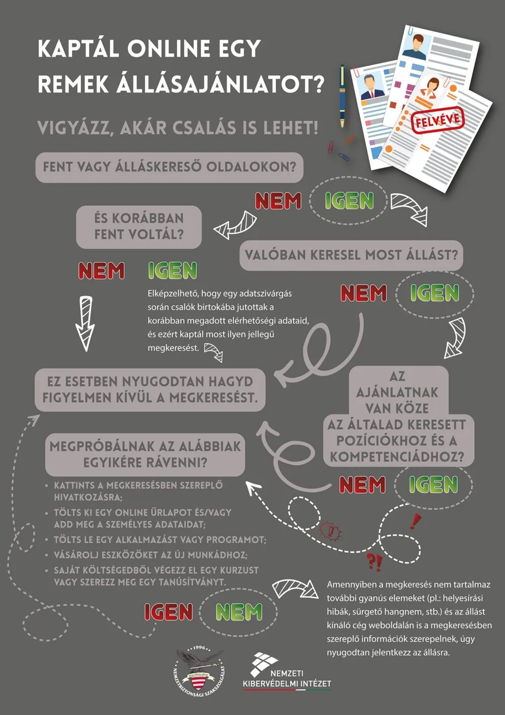 Aki olyan cégtől kap ajánlatot, ahová nem is jelentkezett, vagy olyan pozíciót kínálnak fel neki, amihez nincs is végzettsége, érdemes vigyáznia. Ennél a csalástípusnál is igaz az alapszabály: ami túl szép ahhoz, hogy igaz legyen, az vélhetően nem is az. Gyanús jel még a sürgetés, a fizetős belépő (pl. a munka elkezdéséhez el kell végezni egy fizetős képzést), a közvetítő díj és ha a fájl neve például allasajanlat.pdf.exe. Erre különösen érdemes odafigyelni, mert ha a név végén ott az .exe kiterjesztés, az sosem dokumentum, hanem egy futtatható program!