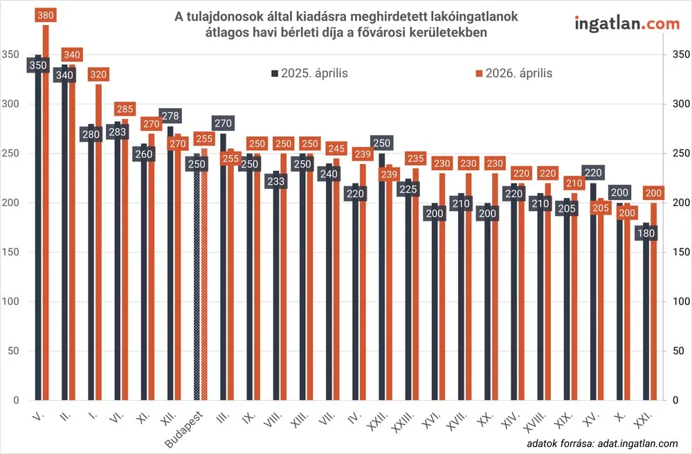 A fővárosban érdekes kettősség figyelhető meg. Míg az alapvetően drága budai hegyvidéki kerületekben (I., II., XII.) a tulajdonosok óvatosabbak voltak (éves szinten csupán 4,1%-os növekedés), addig a külső budai részeken és a pesti átmeneti zónában komolyabb drágulás ment végbe. A legnagyobb drágulás a III., XI. és XXII. kerületekben ment végbe (8,8%). A szakértői elemzés szerint a fővárosi medián lakbér április közepén 255.000 forint körül alakult.