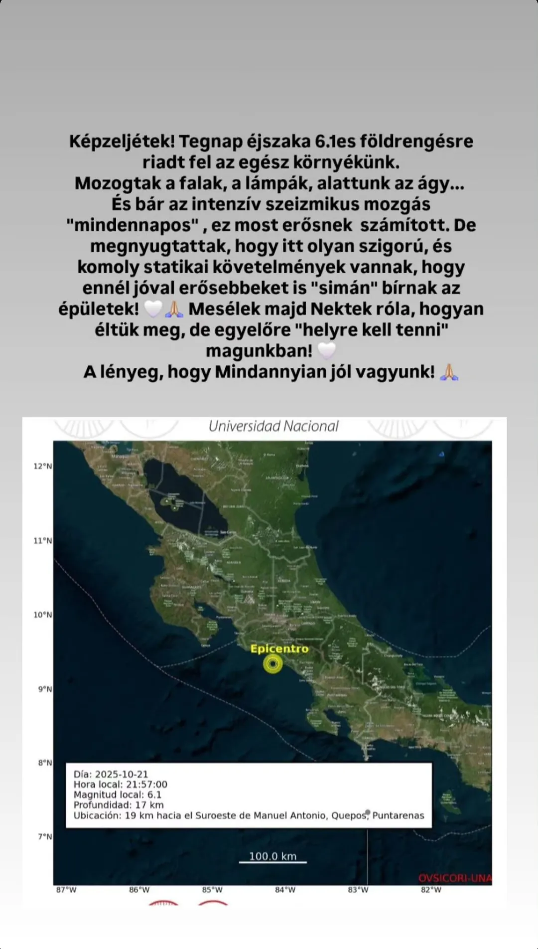 Dobó Ági közösségi oldalán gyakran oszt meg élménybeszámolókat Costa Ricából, ám tegnap este lesokkolta követőit, amikor egy földrengésről írt Instagram-történetében.