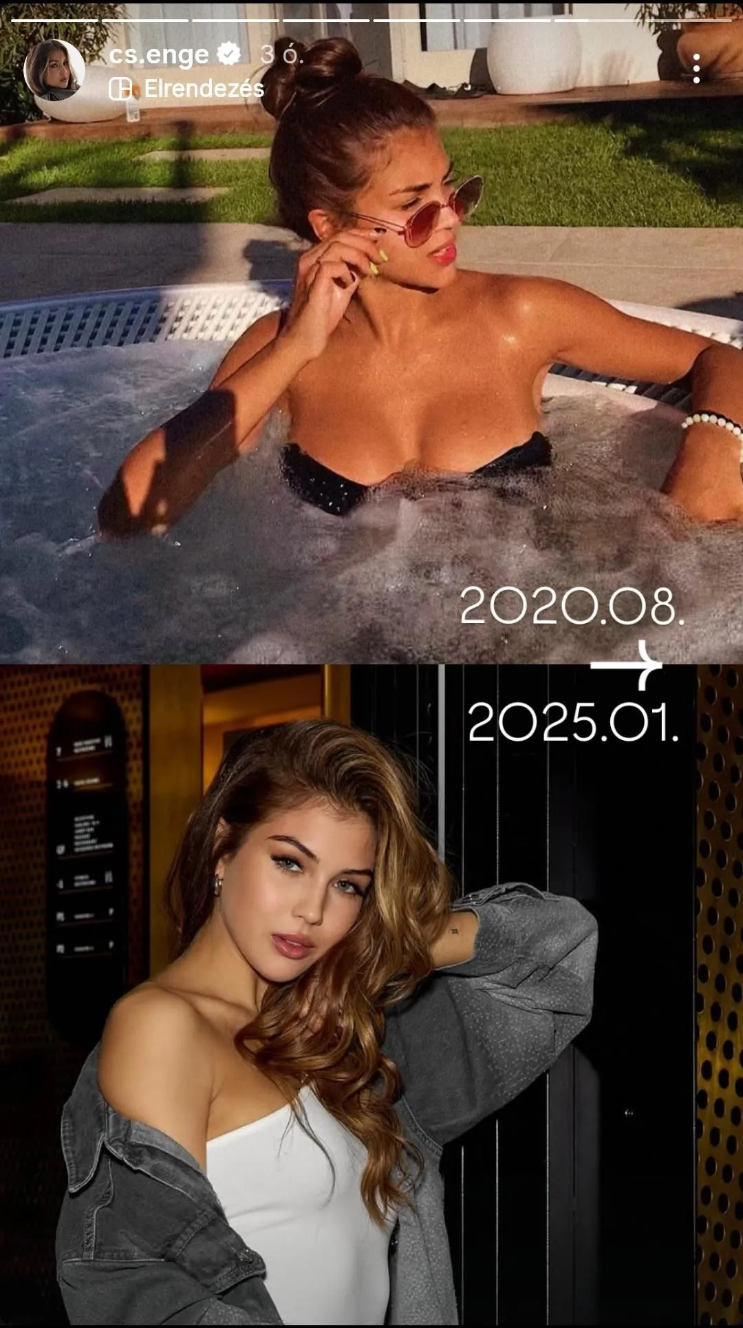 Nos, Csenge most pontot tett a pletykák végére, mégpedig a legjobb módon: saját Instagram-oldalán reagált a bántó megjegyzésekre. A fiatal lány egy összehasonlító fotót posztolt magáról, amelyen 2020-as és 2025-ös képei láthatók egymás mellett. A képek alapján jól látszik, hogy 2020-ban, 17 évesen még más volt az alakja, de akkor sem kellett szégyenkeznie a dekoltázsát illetően. Azóta felnőtté vált, változott, és semmi sem utal arra továbbra sem, hogy bármilyen beavatkozáson esett volna át.
