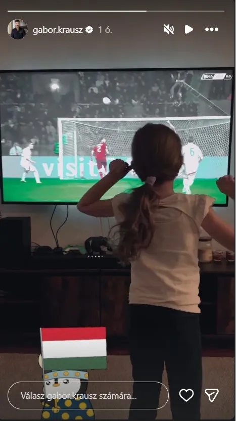 A magyar válogatott Vb-selejtezőjét pedig Krausz Gábor is nagy figyelemmel kíséri, korlátozott ideig elérhető Instagram-története szerint pedig a sztárséf mellett kislánya, Hannaróza is elképesztő bedobással szurkol a magyar csapatnak.