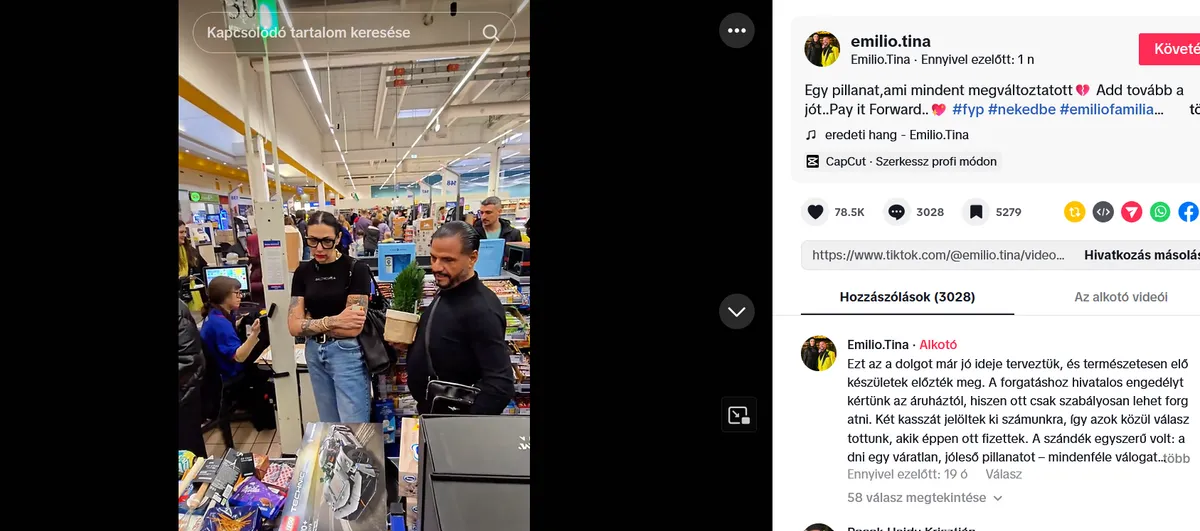 Történt ugyanis, hogy Emilio és Tina – sokunkhoz hasonlóan – beleszerettek azokba a rövid, de annál érzelmesebb videókba, melyeken különböző influenszerek kifizetik a sorban előttük álló, többnyire idős, vagy elesett emberek vásárlásainak ellenértékét. El is határozták, hogy az idei ünnepi időszakban követik a jó példát és hosszas szervezés árán sikerült is leforgatniuk a saját kis összeállításukat, melyben több családnak is hatalmas meglepetést okoztak. A Bors felkereste a házaspárt, akik nagy örömmel meséltek a sikeres akciójukról. „Nagyon régóta terveztük már, hogy kipróbáljuk azt a trendet, amit a külföldi, sikeres Tiktokkerek már több helyen meghonosítottak.”
