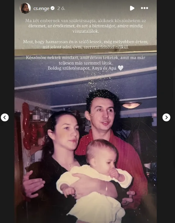 Horváth Csenge a kép mellett megjegyezte, hogy hamarosan ő is szülő lesz, és így még jobban érti, mit jelent „adni, óvni, szeretni feltétel nélkül.” Mint írta, két embernek van születésnapja, nekik köszönheti az életét, az értékeit, a biztonságot, amelyhez bármikor visszatalálhat.