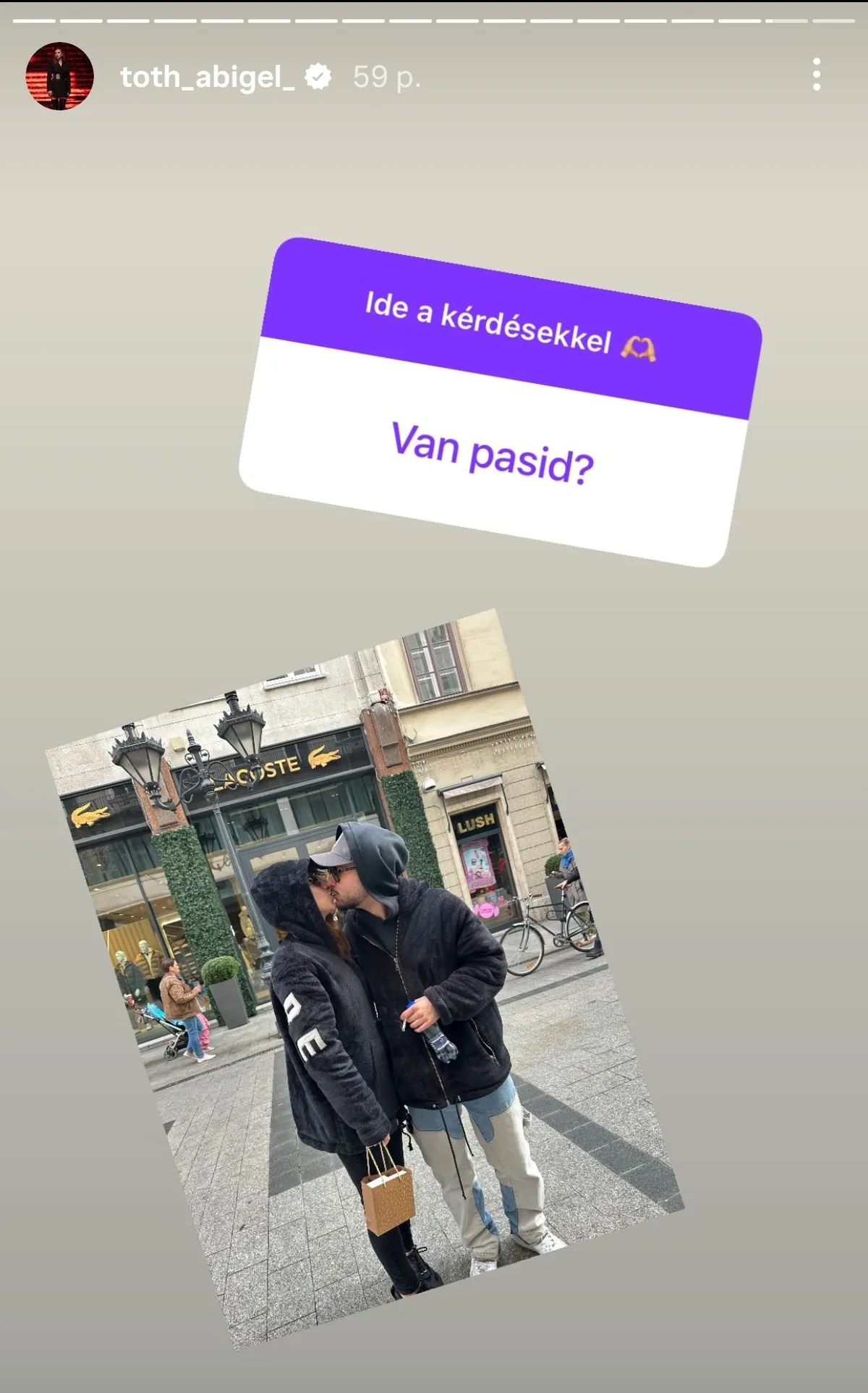 Azért, hogy senkiben ne maradjon kétely, Abigél arra a kérdésre is egyenesen felelt, hogy „van-e pasija”. Szavak helyett egy képet osztott meg, amin a titokzatos szemüveges férfival gyors csókot vált.