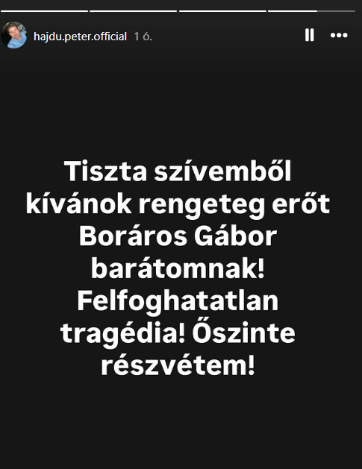 Hajdú Péter ugyancsak 24 órán át elérhető történetben osztotta meg gondolatait: "Tiszta szívemből kívánok rengeteg erőt Boráros Gábor barátomnak! Felfoghatatlan tragédia! Őszinte részvétem!"