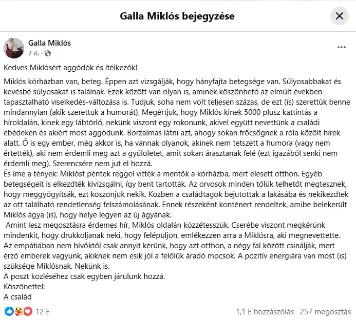 Ahogy arról a Bors elsőként számolt be múlt szerdán: Galla Miklós házához a hatóságok érkeztek ki, és mentővel vitték kórházba a parodistát. A körülmények kapcsán sok volt a kérdőjel, amivel kapcsolatban kedd reggel a családja öntött tiszta vizet a pohárba. Hosszú közleményben árulták el, a humorista pénteken elesett az otthonában, ami után mentővel kórházba vitték, ahol alaposan kivizsgálják a humoristát. Mint írták, olyasmire is fény derült, ami magyarázatot ad az elmúlt években jelentkező viselkedés-változásra is. A bejegyzésükben végezetül elmondták, pozitív visszajelzésekre nagy szükség lenne.