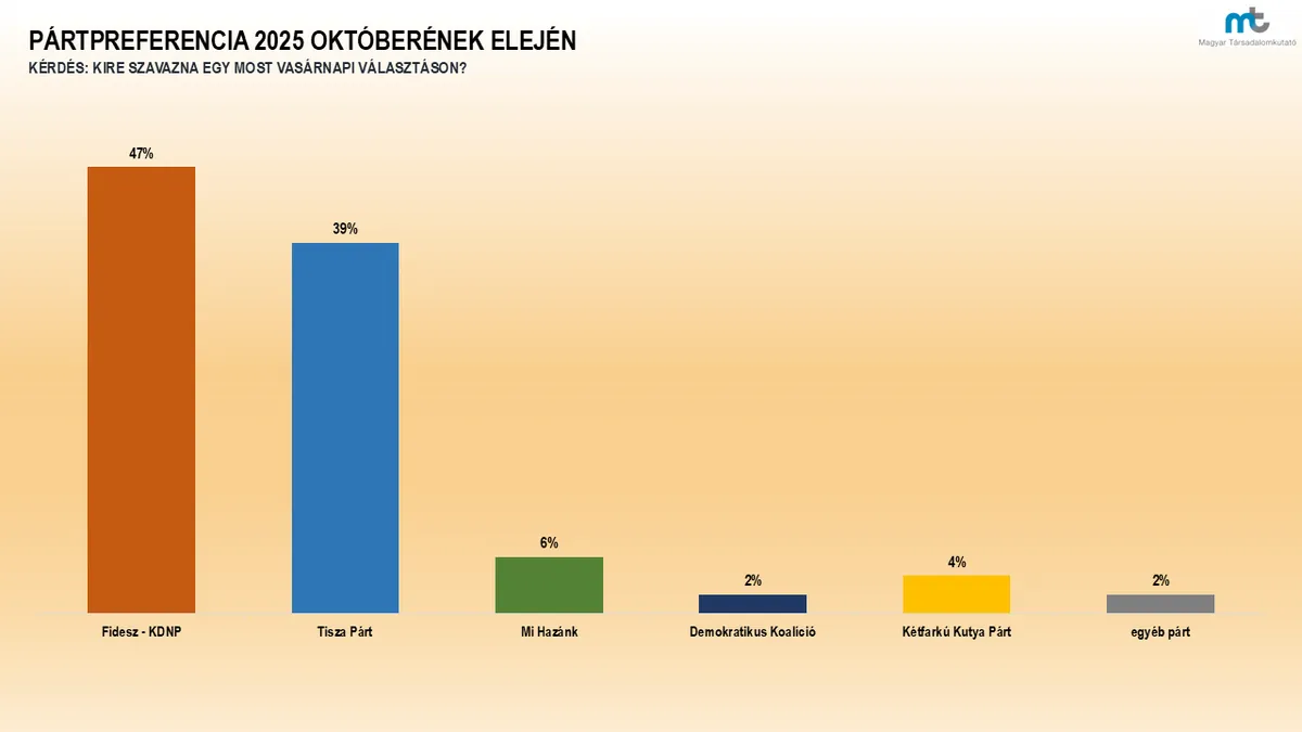 A Magyar Társadalomkutató felmérése alapján jelenleg három politikai erő számíthat biztos parlamenti jelenlétre: a Fidesz–KDNP, a Tisza Párt és a Mi Hazánk Mozgalom. Jelen állás szerint a 4 százalékos Kétfarkú Kutya Párt is közel áll, hogy átlépje a belépési küszöböt. A Demokratikus Koalíció támogatottsága továbbra is messze elmarad a parlamenti bejutás határától.