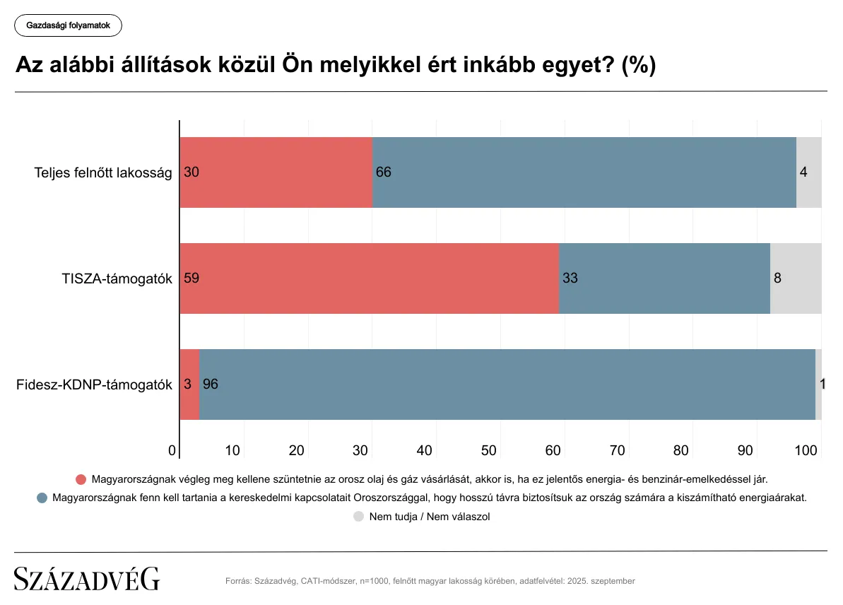 A Tisza párt beemelte programjába Brüsszel orosz energia tiltására vonatkozó célkitűzését, vagyis, hogy Magyarország kedvező áron ne vásárolhasson orosz olajat. Az intézkedés minden magyarnak súlyos költségeket okozna – derül ki a Századvég friss kutatásából. A Századvég új kutatási adatai szerint Brüszel orosz energiahordozókra, nyersanyagokra vonatkozó tiltása megosztja a politikai táborokat. Míg a Tisza-szimpatizánsok 59 százaléka támogatja, a Fidesz-KDNP szavazóinak 96 százaléka elutasítja a lépést.