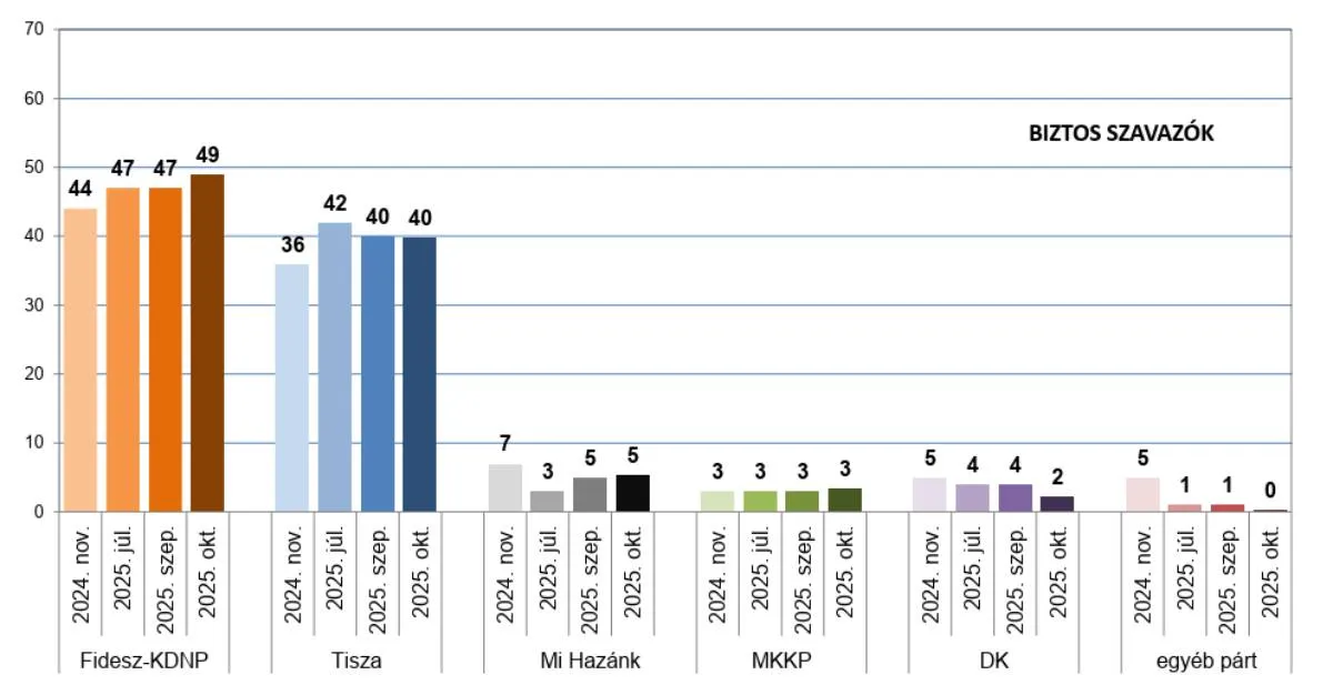 A felmérés alapján immár 9 százalékpontos a kormánypártok előnye a biztos szavazók körében. Ők azok a választópolgárok, akik részvételüket biztosra ígérnék egy most vasárnapi országgyűlési választáson, valamint megjelölték, melyik pártra szavaznának, vagy egyéb kérdésekre adott válaszaik alapján besorolásra kerültek egy adott párt szavazótáborába. Az őszi politikai szezonkezdet egyértelmű nyertese a Fidesz-KDNP, amely növelni tudta előnyét a megtorpanni látszó Tisza Párthoz képest szeptemberről októberre, minthogy a kormánypártok két százalékpontos erősödése mellett stagnál Magyar Péter pártjának támogatottsága.