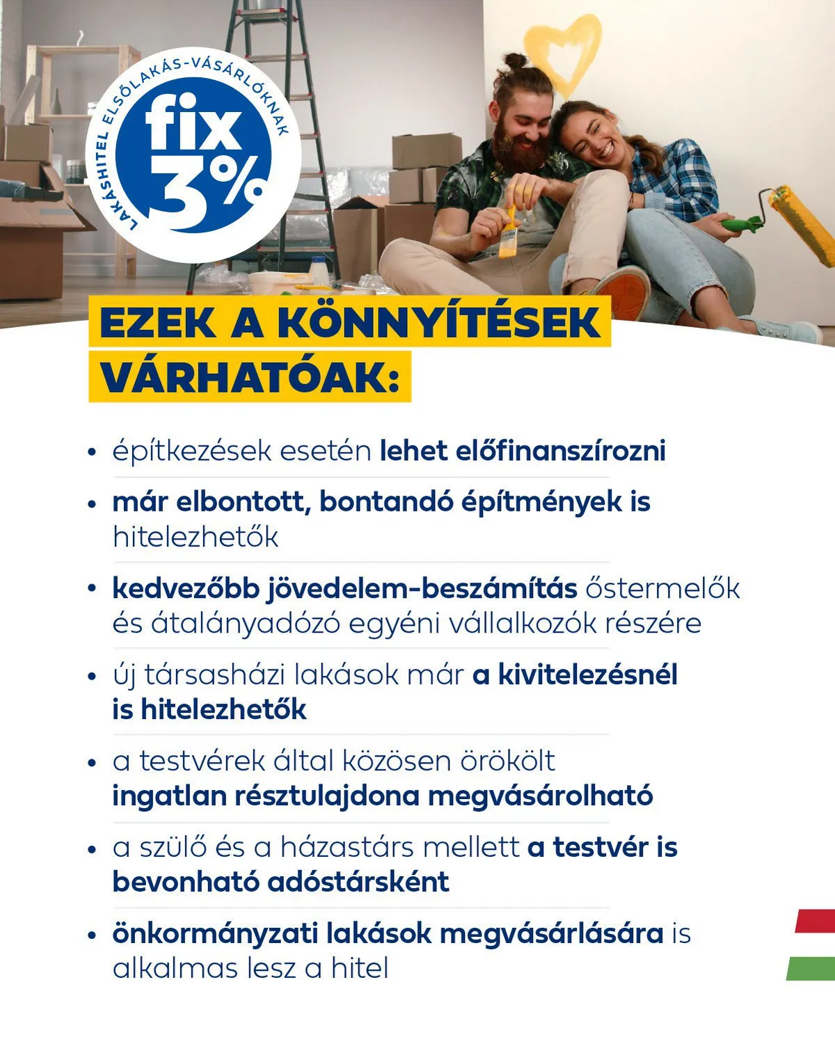 További fontos újítás pedig az, hogy az önkormányzati lakások megvásárlására is kiterjesztik a három százalékos fix lakáshitel lehetőségét, azzal a kedvezménnyel, hogy az önkormányzat a lakást a főszabálytól eltérően az ingatlan becsült piaci értékétől akár 20 százalékkal olcsóbban is eladhatja.