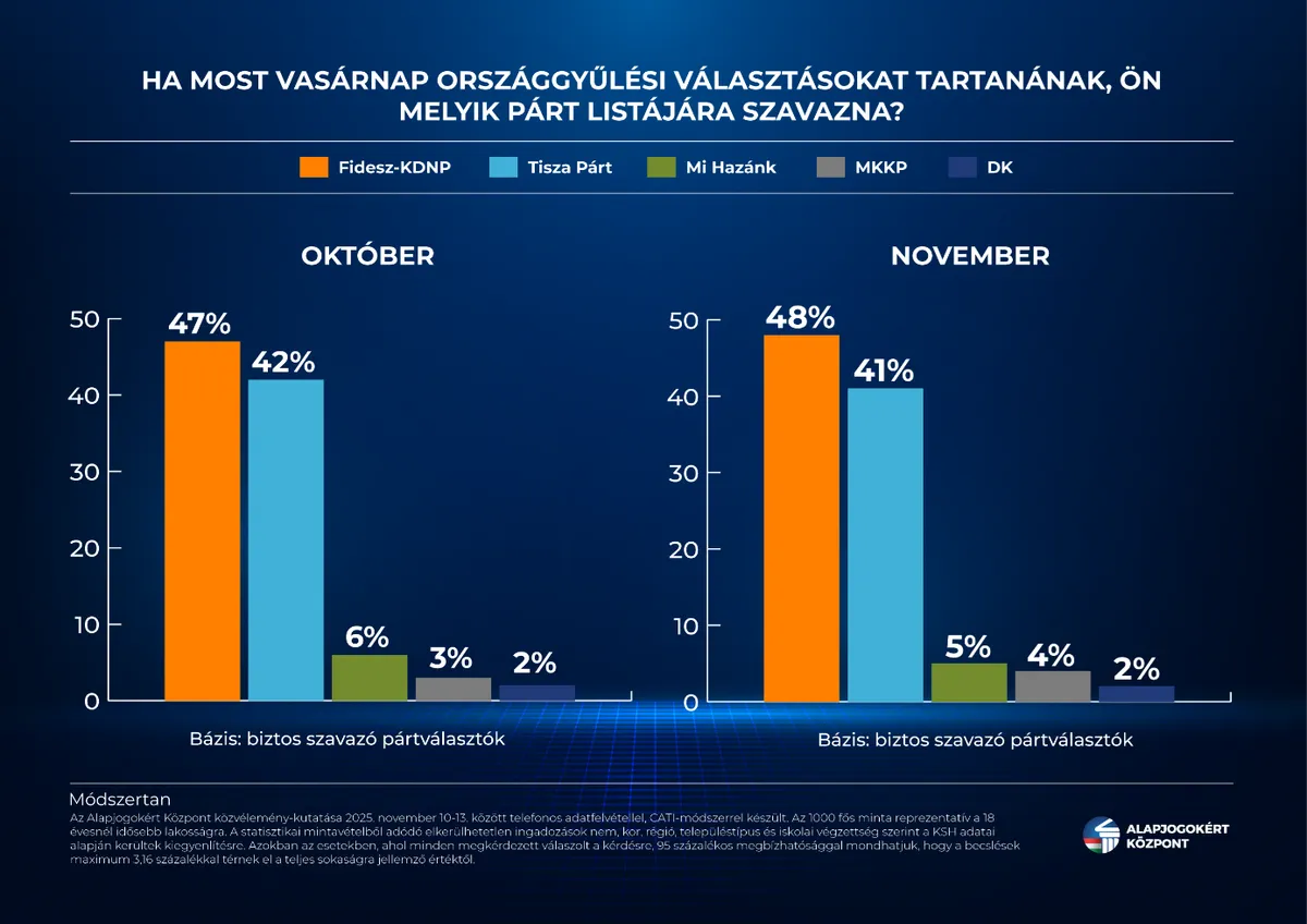 A kormánypártok támogatottsága az előző hónaphoz képest 1 százalékponttal erősödött, míg a Tisza Párt ugyanennyivel gyengült. Az októberi felmérés eredményeihez képest mindez azt jelenti, hogy 5 helyett 7 százalékponttal volt népszerűbb az Orbán Viktor által képviselt békepárti, rezsicsökkentést fenntartó, migrációs paktumot elutasító politika mint Magyar Péter adóemelésre, nyugdíjcsökkentésre és brüsszeli elvárásoknak megfelelésre építő programja. A hibahatáron belüli elmozdulás mögött az adatszivárgási botrány is állhat: a Tisza Párt folyamatos magyarázkodásra kényszerül az ukrán cég által is fejlesztett mobilapplikációból kikerülő adatok miatt, ami demobilizálhatja támogatóit is. Ezzel szemben Orbán Viktor történelmi jelentőségű megállapodásokat kötött Donald Trump amerikai elnökkel, a csúcstalálkozó hatására nemcsak időkorlát nélküli energetikai szankciómentesség, de a paksi atomerőmű bővítésére vonatkozó egyezségek is születtek.