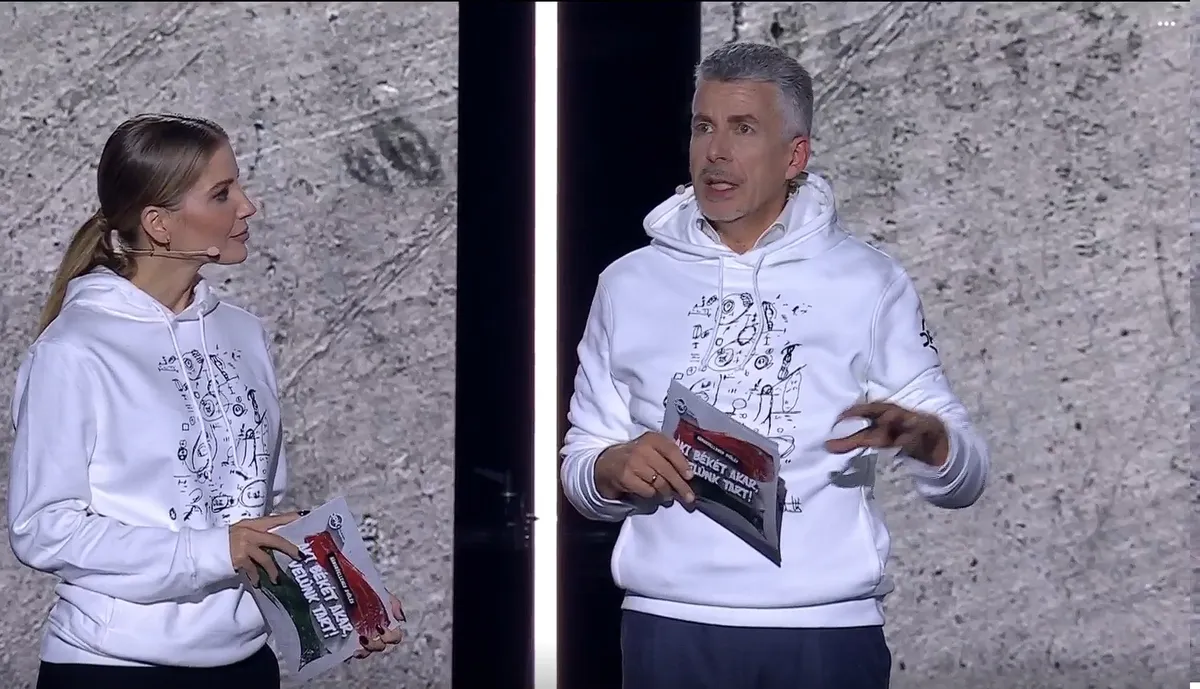 A firkának tűnő ábra meglepő gyorsasággal vált egyébként népszerűvé, és annyian kezdték el keresni, hogy végül mintaként pulóverre is felkerült, amelyet már napokkal ezelőtt előrendelhetővé tettek a rajongók számára. Amikor Szabó Zsófi Rákay Philip mellett megjelent a pulcsiban, a közönség soraiban azonnal felismerte mindenki, hogy arról a bizonyos Orbán-firkás felsőről van szó. Sőt végül Rákay Philip is beadta a derekát és lecserélte elegáns öltönyét, hogy helyette ő is az ikonikus pulcsiban képviselje magát.