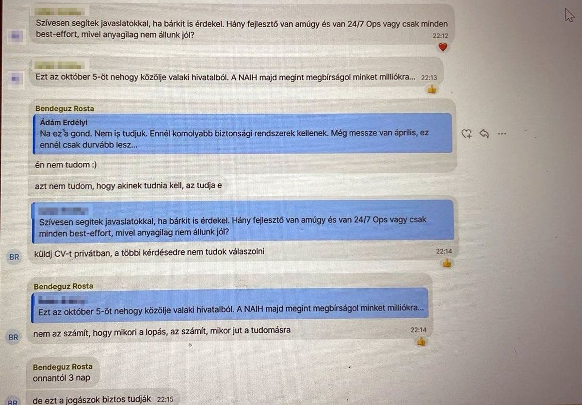 A lap által megszerzett beszélgetésnek van egy másik igen érdekes része is. Az egyik tiszás csoporttag ugyanis arra hívta fel a többiek figyelmét, vigyázni kell, ki ne derüljön, hogy valójában október 5-én szivárogtak ki a személyes adatok az alkalmazásból, mert akkor a Nemzeti Adatvédelmi és Információszabadság Hatóság (NAIH) megbüntetheti a pártot, amiért nem jelentették időben az incidenst.