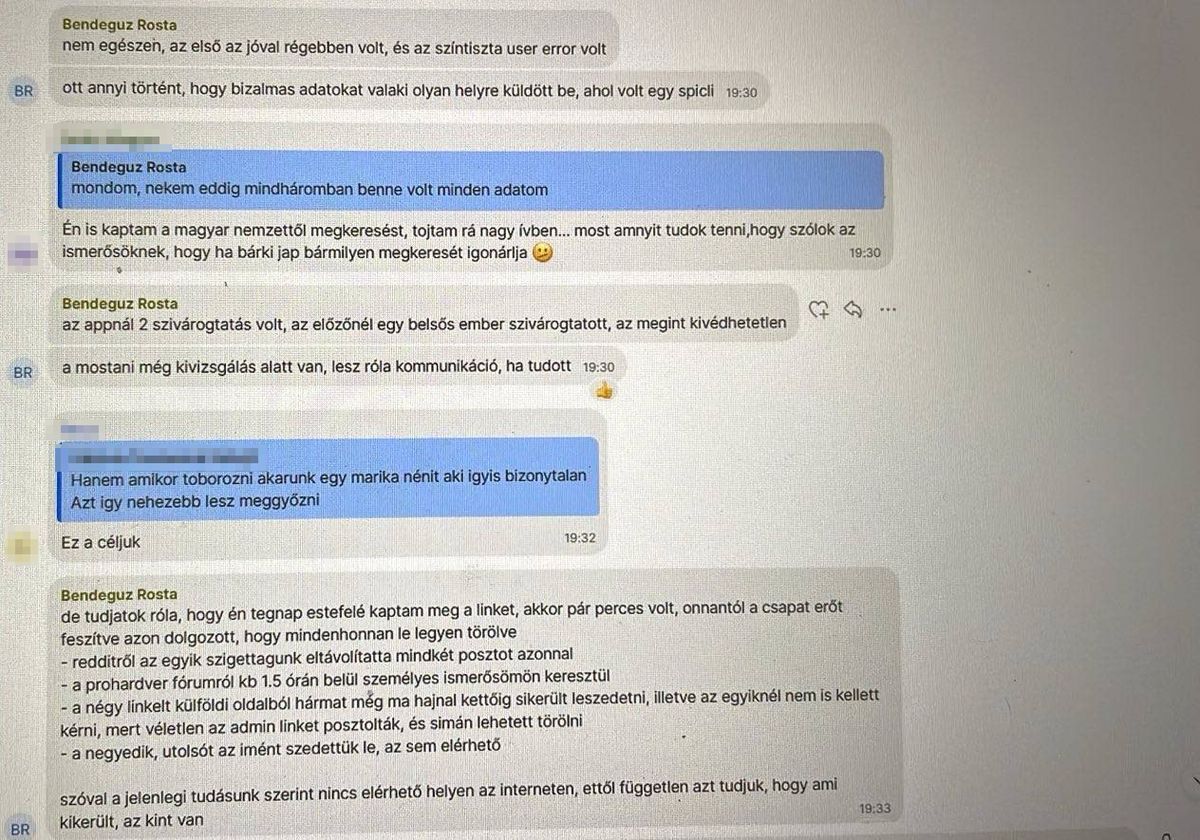 A Magyar Nemzet exkluzív cikkben árul el információkat: kiderült miről beszélgettek a tiszás informatikusok és a többiek a zárt Signal-csoportban vasárnap este. A beszélgetés lényege akkor indult el, mikor a tiszások meglátták azokat a cikkeket, amelyek a 200 ezer nevet érintő adatszivárgásról szóltak. Ekkor a Tisza párt vezető informatikusa, Rosta Bendegúz osztott meg bennfentes információkat a csoport tagjaival.