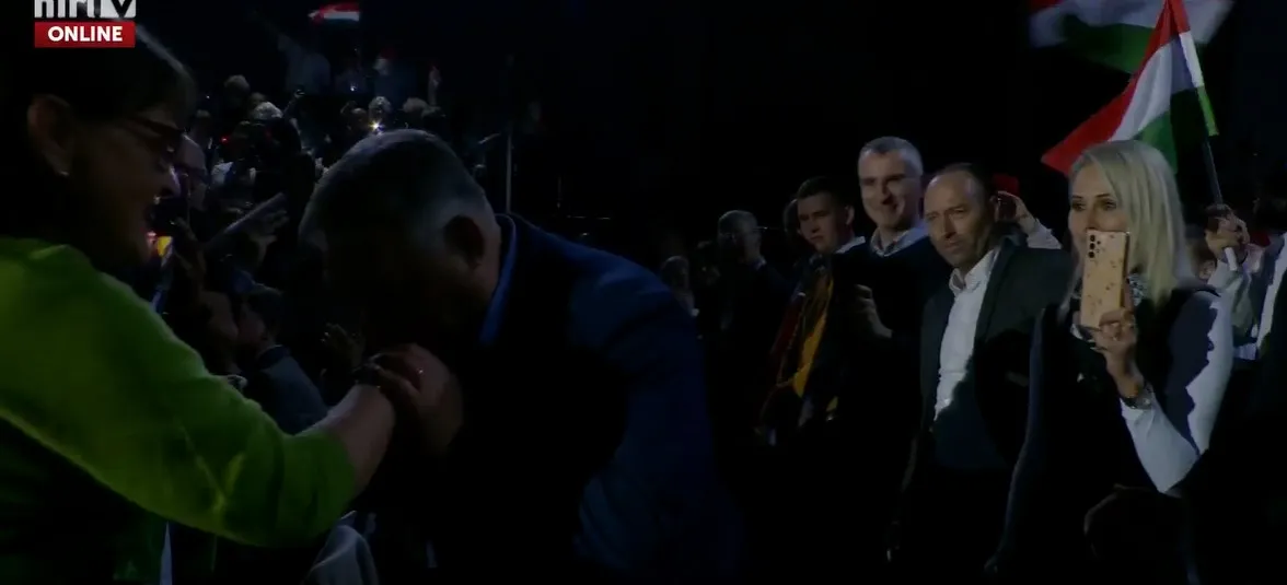 Orbán Viktor a Szabadság vándorai dallamára vonult be Győrben az első Háborúellenes gyűlés színpadára. Az emberek kezet fogtak vele, simogatták a hátát, és hamarosan felzúgott a "Viktor, Viktor" is.