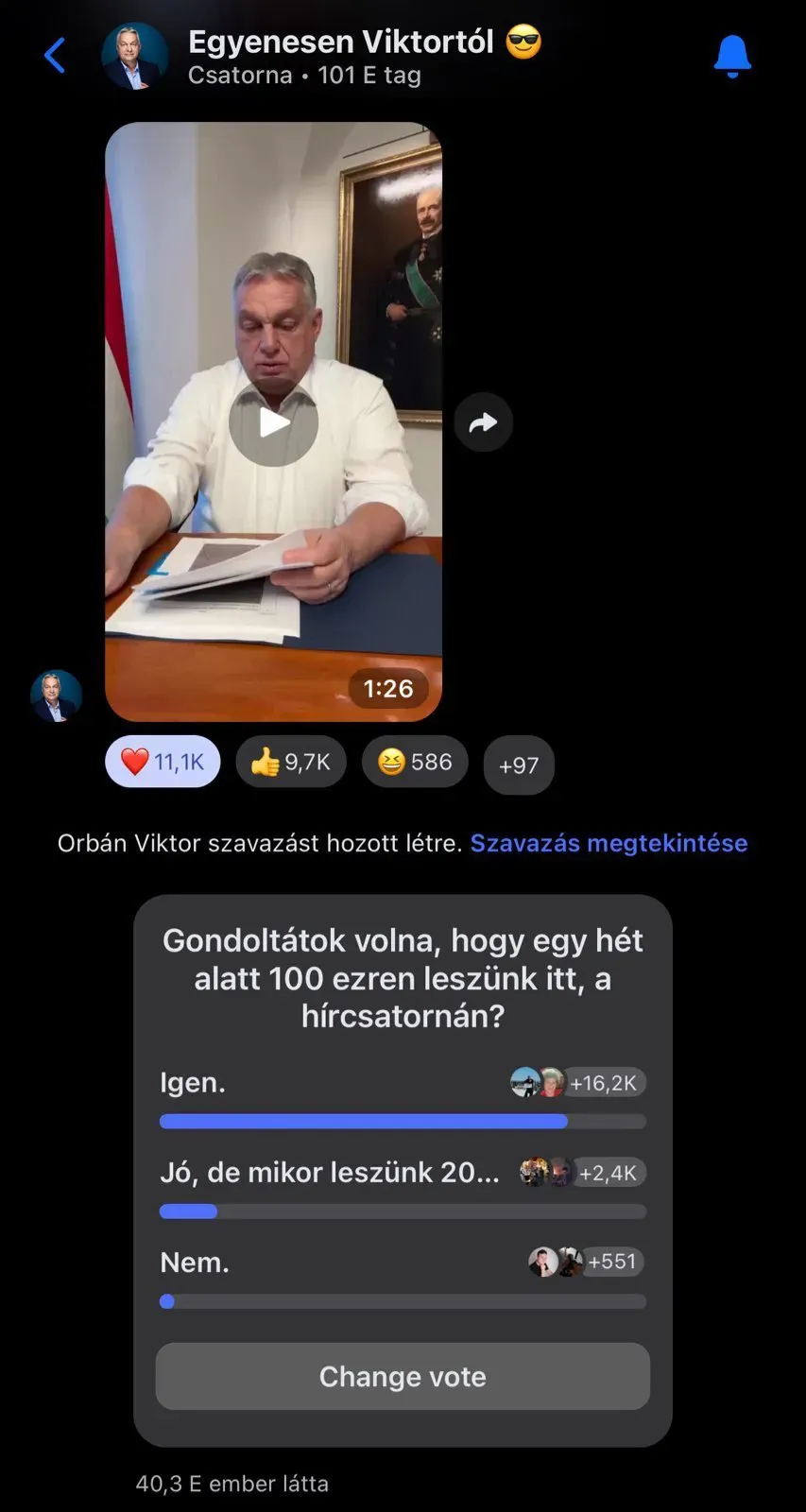 A 100 ezer fölötti csatlakozóval ez lett messze a legnagyobb Facebook Messenger csatorna Magyarországon, ami egy direkt kommunikációs kapcsolatot jelent a miniszterelnök és a követői között, hiszen a csatlakozók egyenesen Orban Viktortól kapnak üzeneteket az ország sorsát érintő legfontosabb fejleményekről.