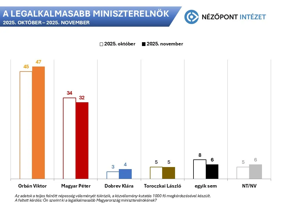 A Nézőpont Intézet októberben, az október 23-ai rendezvények előtt és november végén, a Tisza jelöltállítása során is feltette a 2026-os választás egyik kulcskérdését, hogy a magyarok kit tartanak Magyarország legalkalmasabb miniszterelnökének. A hivatalban lévő miniszterelnök már októberben is egyértelműen vezette a kormányfő-versenyt. Akkor a teljes felnőtt magyar társadalmat reprezentáló mintán készült kutatás válaszadóinak 45 százaléka tartotta őt a legalkalmasabb kormányfőnek, míg 34 százalékuk Magyar Pétert. További három százalék Dobrev Klárát, öt százalék pedig Toroczkai Lászlót nevezte meg, 13 százalék pedig senkit sem.