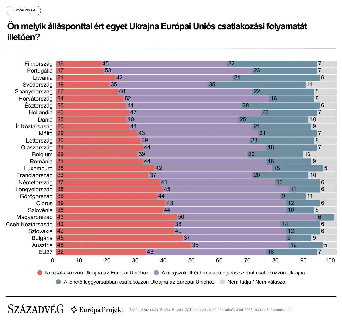 A brüsszeli elképzelést támogatók aránya még a leginkább Ukrajna-párti skandináv országokban is kisebbségben van: a svédek 35, a finnek 32 százaléka értene egyet Ukrajna feltétel nélküli beléptetésével. A skála másik végén Magyarország és Ausztria áll, ezekben az országokban a felnőtt lakosság 93 és 83 százaléka utasítja el az azonnali csatlakozást.