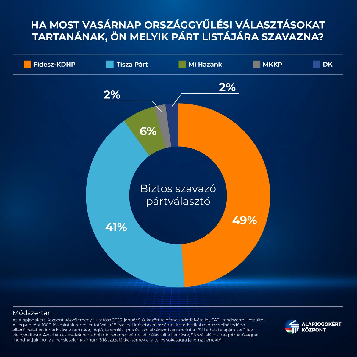 A Fidesz-KDNP országos listáját a biztos szavazó pártválasztók 49 százaléka támogatná egy most vasárnap esedékes választáson, míg a Tisza Pártra csak 41 százalékuk voksolna – derül ki az Alapjogokért Központ friss, országosan reprezentatív közvélemény-kutatásából.