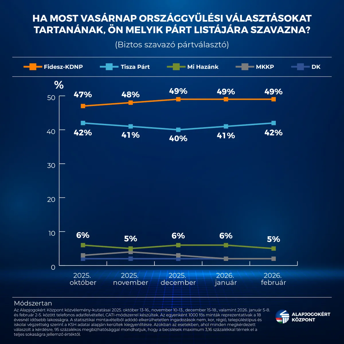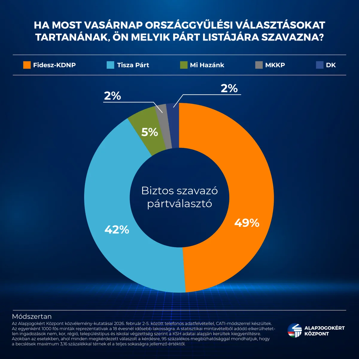 A Fidesz-KDNP országos listáját a biztos szavazó pártválasztók 49 százaléka támogatná egy most vasárnap esedékes választáson, míg a Tisza Pártra 42 százalékuk voksolna – derül ki az Alapjogokért Központ friss, országosan reprezentatív közvélemény-kutatásából.