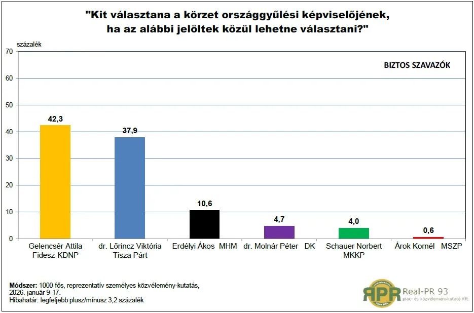 A vidék kutatója, a Real-PR 93 2026 januárjában 1000 fős, személyes kérdezésen alapuló felmérést készített Somogy vármegye 1-es választókerületében, amelynek Kaposvár a székhelye.