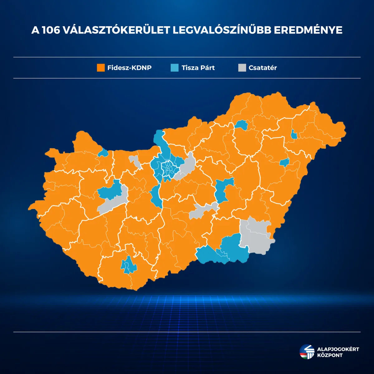 Az Alapjogokért Központ mandátumbecslése alapján az egyéni választókerületek egyértelmű többségében a Fidesz-KDNP jelöltje diadalmaskodhat az április 12-ei országgyűlési választáson. A 106 választókerületből 64-ben a Fidesz-KDNP, 35-ben a Tisza arathat sikert, további 7 körzetet pedig csatatérként azonosítottak. A jobboldali győzelem várható mértéke a választási rendszer egyéni ágán abba az irányba mutat, hogy Orbán Viktor ismételten stabil parlamenti háttérrel rendelkező kormányt alakíthat április 12-e után, amely képes Magyarországot kívül tartani a háborún, az energiaválság korában fenntartani az olcsó orosz olajat és gázt is magában foglaló többirányú beszerzési stratégiát, valamint a rezsicsökkentésen túlmenően az egykulcsos adó és adókedvezmények jelenlegi rendszerét is.