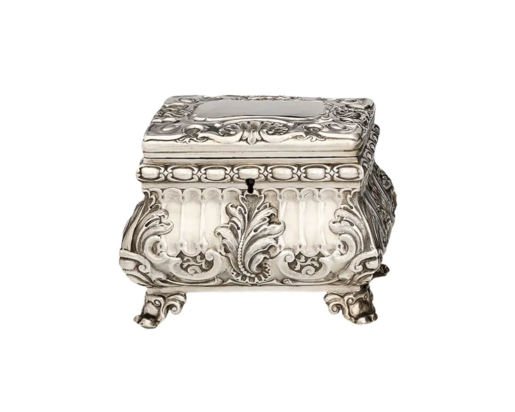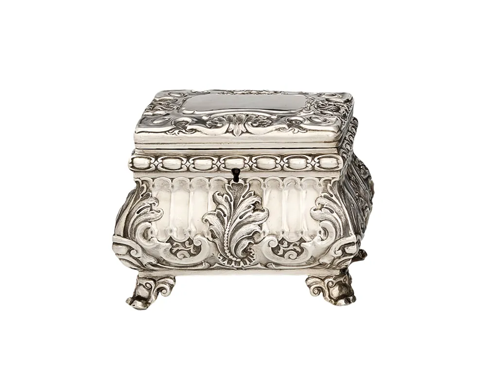 Az ezüsttárgyak között is igazi kincsekre bukkanhatunk: a Pest, 1940 körül készült elegáns art deco kínáló (120 000 Ft) modern terekben is remekül mutat, míg a részletgazdag, aranyozott belsejű neorokokó cukordoboz (Bécs, 1860, 130 000 Ft) igazi gyűjtői darab, működő zárszerkezettel.