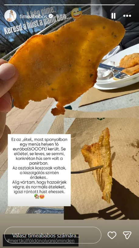 – írta egy rántott húsról készült kép mellé Babos Tímea. Hozátette, ebben az árban se előétel, se leves, se semmi nem volt benne, konkrétan hús sem volt a panírban.