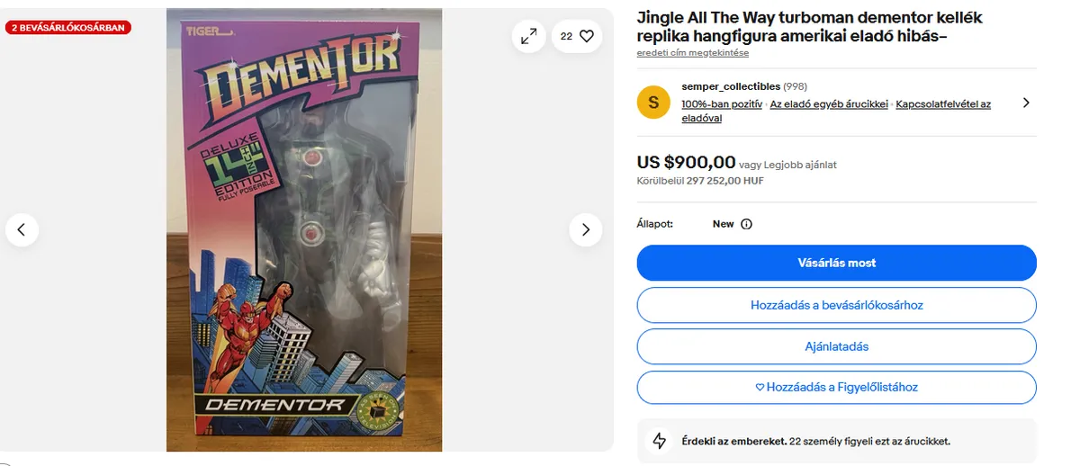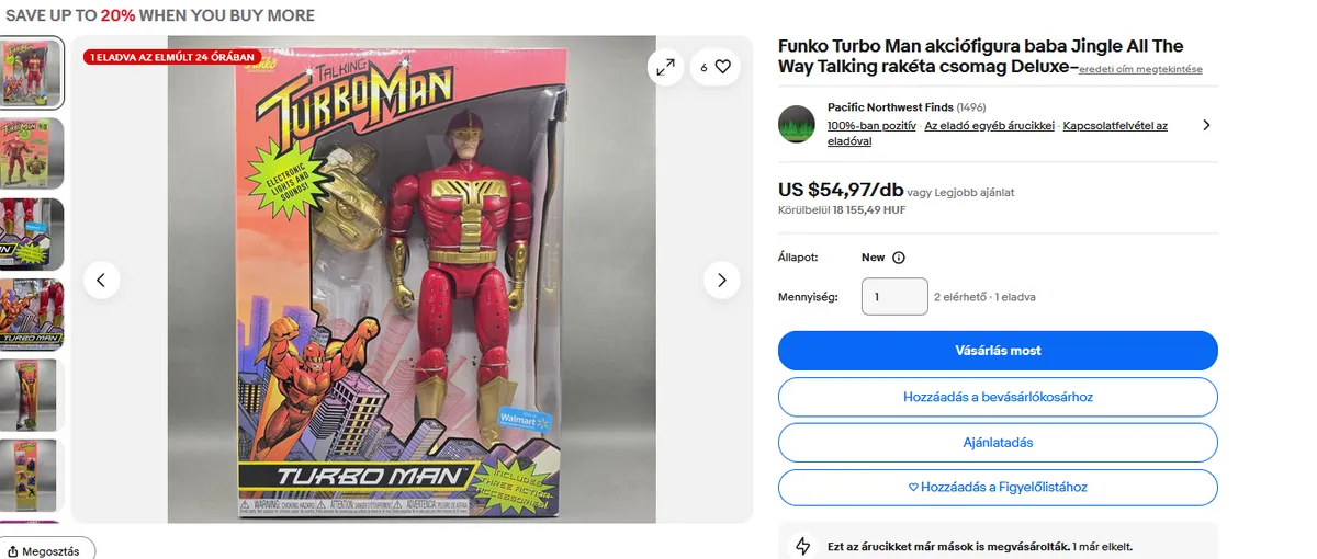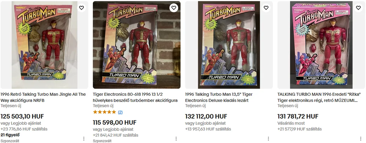 Egy gyors Ebay keresés pedig arra is rávilágít, hogy mennyiért kaphatunk egy Turbo Man figurát 2025-ben. Karácsonyra ezeket már sajnos nem tudjuk megvenni, de érdemes lehet elkapkodni, hogy jövőre ott legyen a fa alatt, vagy a gyüjtők polcain. Ennek tanulsága szerint egy eredeti, 1996-os Tiger Electronics játékbábu bontatlanul akár 120,000-130,000 forint felé is mehet, hozzátéve közel 24,000 forintos szállítási költséget a tengerentúlról. A mai Schwarzinak mindenesetre ez már nem lenne nagy tétel, ha meg akarná venni a kisfiának — de mások akár spórolhatnak egy bontott verzióval 13,000 forintért... dehát az nem olyan.